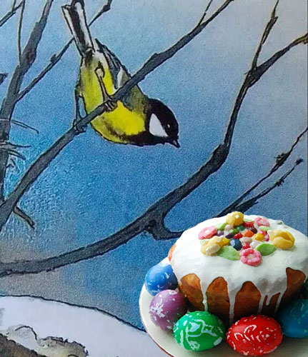 — Доброе утро, солнышко весеннее! Хороший мальчик и его добрая бабушка, которые кормили меня зимой, ничего не имеют к Светлому Христову Воскресенью. Курочка-сестричка даст яички, но их надо покрасить, а у меня нет краски. Помоги: дай краску.