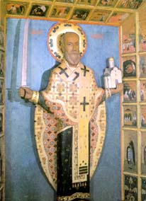 Храм Святителя Николая - один из старейших храмов нашего Свято-Успенского Псково-Печерского монастыря. Стоит церковь при входе в обитель, слева на горе. Она устроена над Святыми воротами в 1565 году преподобномучеником Корнилием при участии Павла Петровича Заболотского, в иночестве Пафнутия.